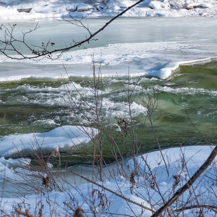 Blue water, translucent, rises as blue-green water rushes through ice.
